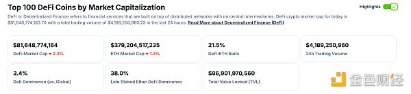 DeFi数据1.DeFi代币总市值:816.48亿美元DeFi总市值 数据来源:coingecko2...