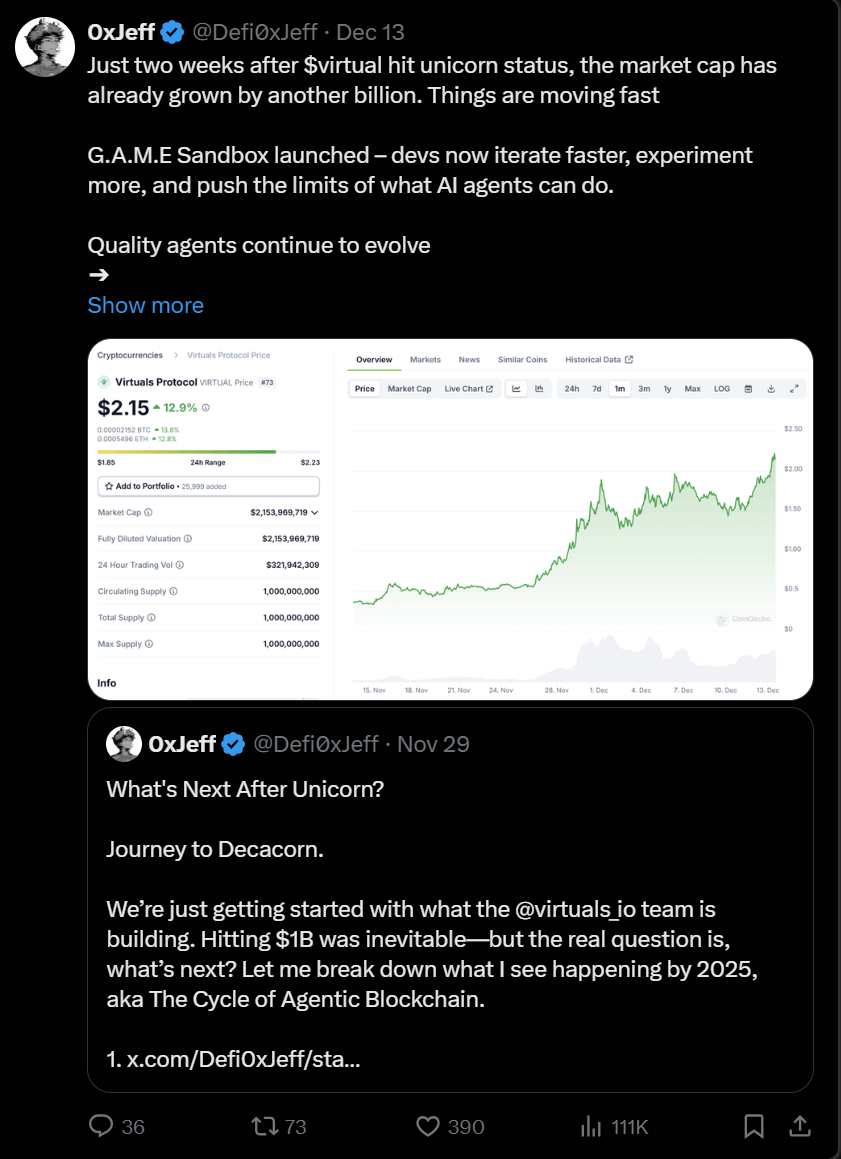Virtuals io 推出了一个平台,用户可以在上面创建 AI 代理并将其代币化,从而有效地为其开发成本提供启动资金。