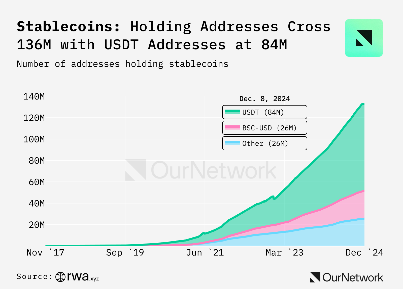 · 稳定币的持有者数量持续增长,目前达到 1.33 亿人。其中,USDT 以 8170 万持有者领先,BSC-USD 则有 2580 万持有者。虽然 USDC 的增长较慢,仅有 1800 万持有者,但像 PYUSD 和 USDe 这样的较小稳定币也在迅速崛起,显示出市场的多样化。