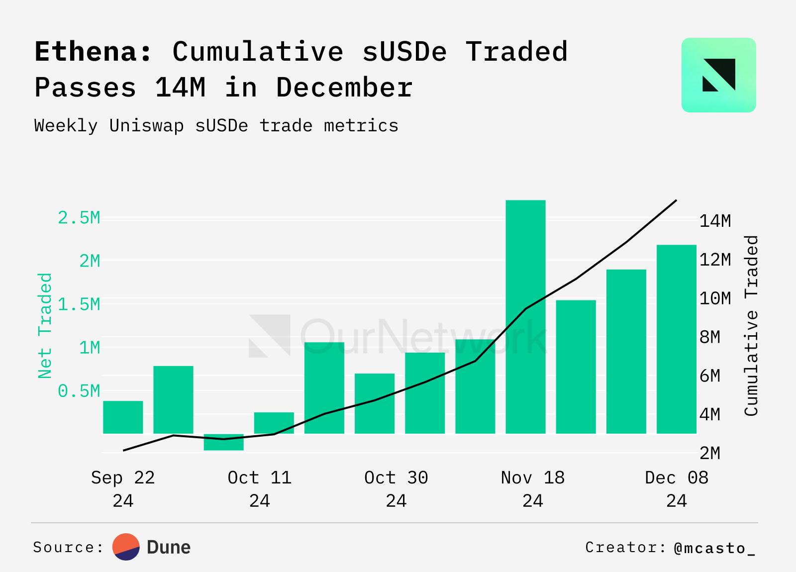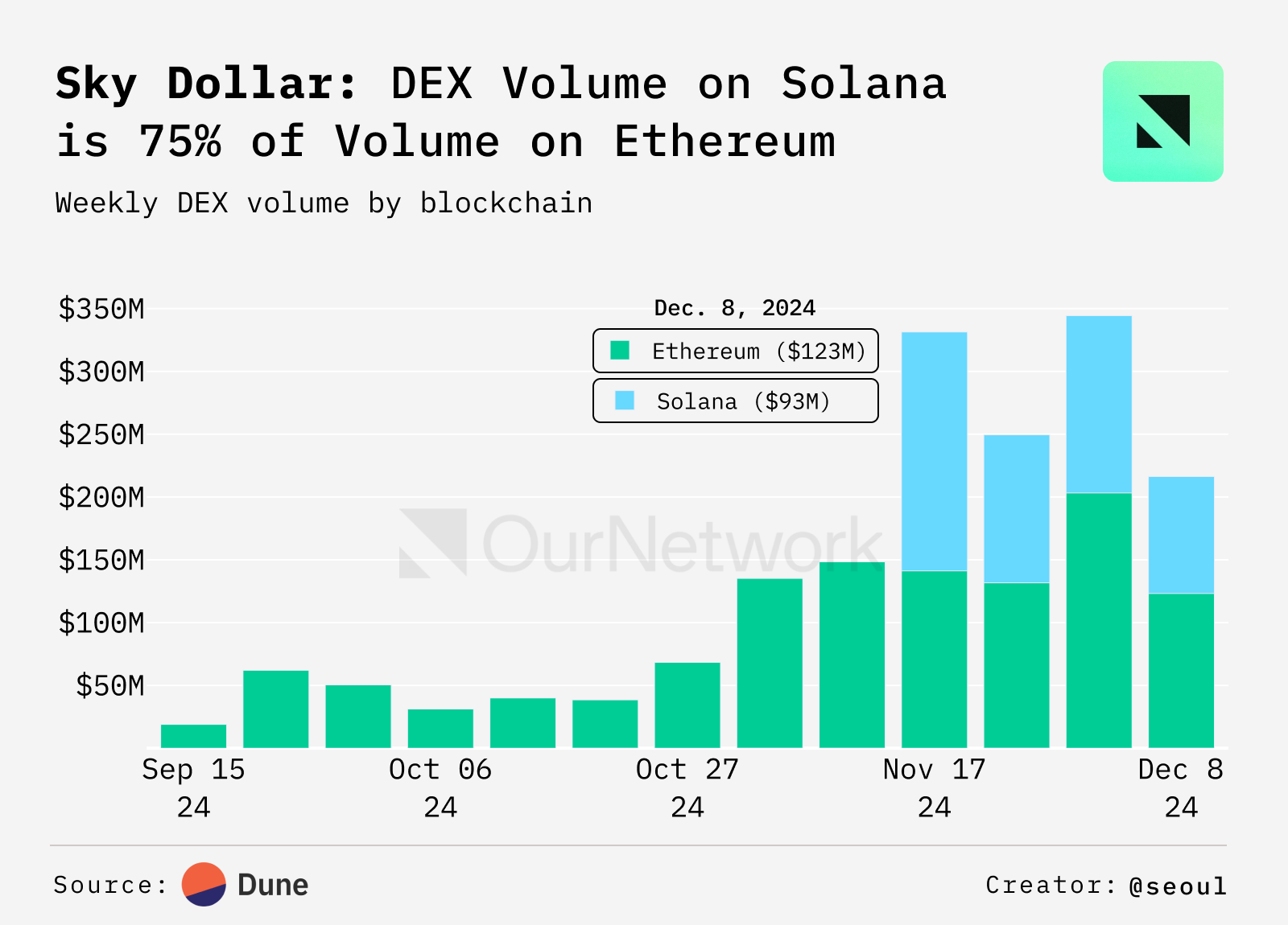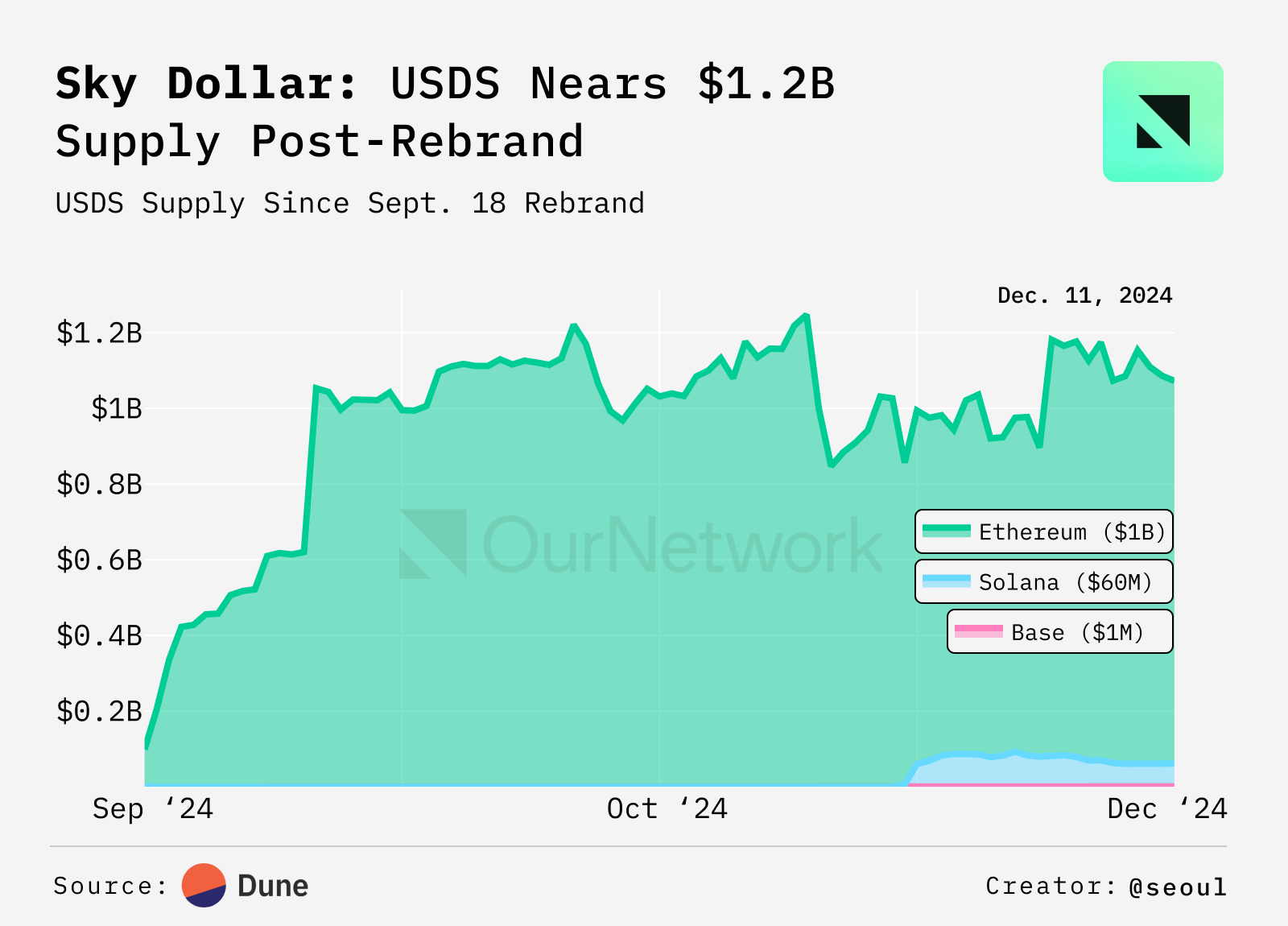 · 自 2024 年 9 月 18 日更名为 Sky Ecosystem 后,USDS (Sky Dollar,前身为 DAI) 在以太坊上线后迅速发展,流通量达到 10 亿美元,并在 11 月中旬达到峰值 12 亿美元。随后,USDS 扩展至 Solana,并计划很快登陆 Base 网络。去中心化交易所 (DEX) 的交易量也在稳步增长,目前以太坊上的累计交易量为 12 亿美元,而 Solana 上已达到 5.42 亿美元。尽管以太坊仍占总供应量的 94%,但 USDS 在 Solana 上的采用率正在快速提升。