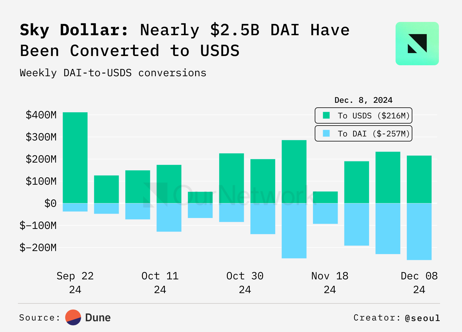 · 更名后,DAI 转换为 USDS 的交易量达到 24 亿美元,而反向转换为 17 亿美元,主要由去中心化交易所的交易推动。尽管 MakerDAO 的更名引发了争议,但 USDS 在多链上的增长和供应的增加,正在使其成为稳定币市场中的有力竞争者。