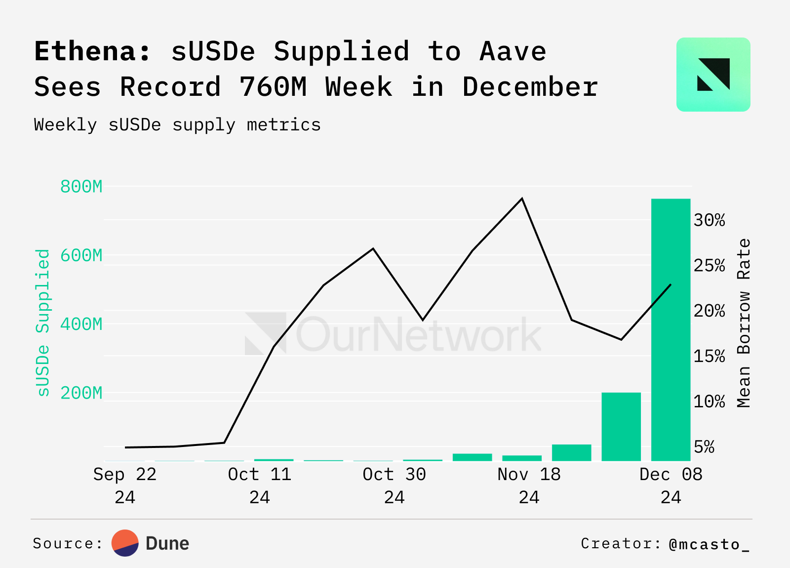 · 由于 sUSDe 的高收益率,借贷市场对其需求持续增长。Aave 在 12 月多次提高供应上限,而每次上限提高后都迅速被触及。同时,USDC 和 USDT 的借贷需求也随之上升。