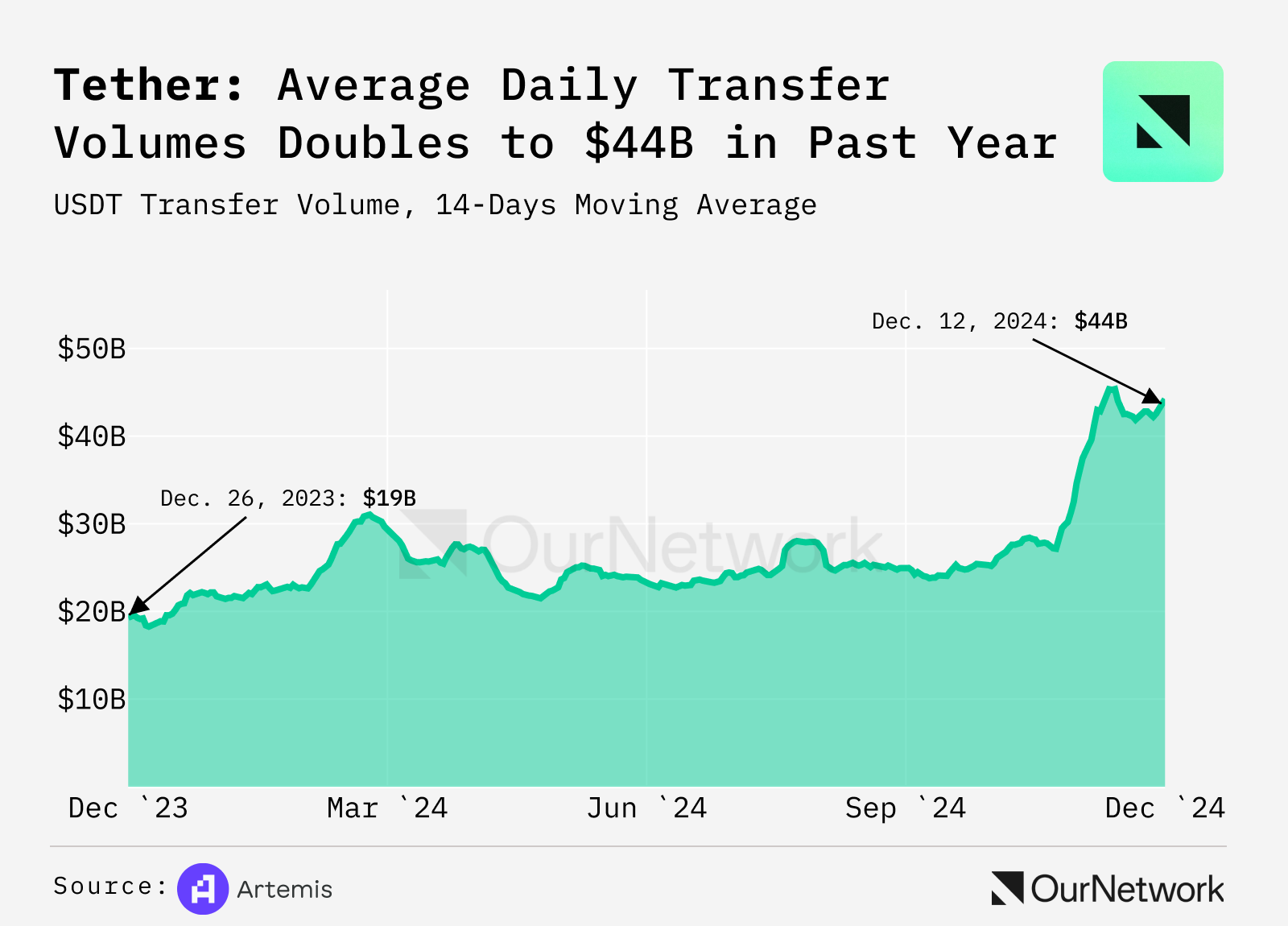 · 在过去一年中,USDT 的每日转账量从 190 亿美元增长到 420 亿美元,翻了一倍(基于 14 天移动平均值)。