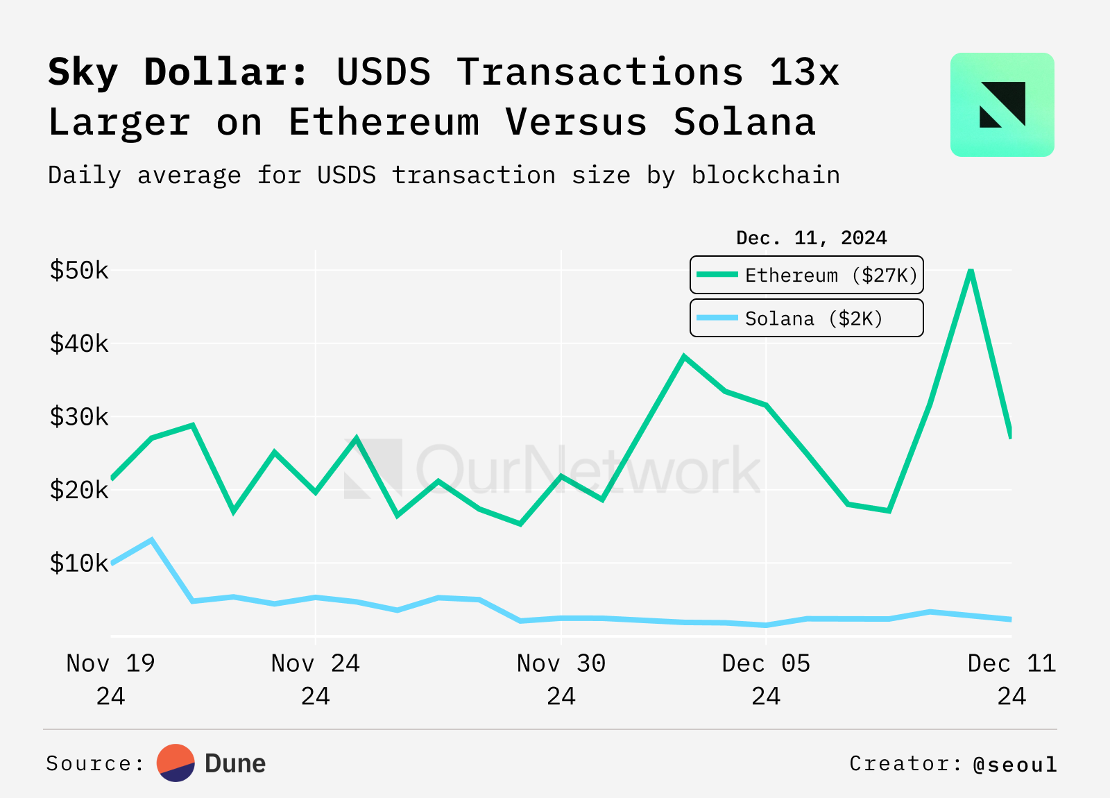 · USDS 的交易在 Solana 和以太坊上表现出不同的特点。Solana 上的交易平均金额为 3000 美元,显示了其在快速、低成本小额支付中的优势;而以太坊上的交易平均金额为 24000 美元,更多用于高价值的金融活动。