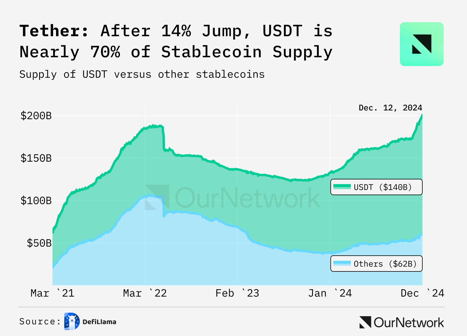 · 稳定币市场总量已突破 2000 亿美元,创下历史新高。在选举后的短短 40 天内,市场从 1700 亿美元增长到 2000 亿美元,这是自 2021 年以来最快的增长速度。Tether (USDT) 增长了 200 亿美元,总量达到 1400 亿美元,位居首位;Circle 的 USDC 增长 60 亿美元,总量达到 410 亿美元;而 Ethena 的 USDe 更是翻倍,从 25 亿美元增长至 55 亿美元。
