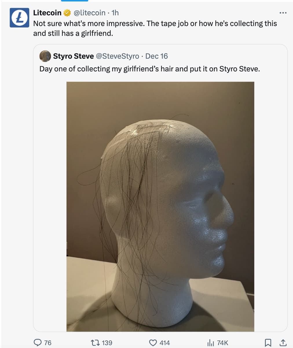 就连 Litecoin、瑞安航空公司等官推也纷纷加入这场狂欢,进一步驱动 Styro Steve 和他的泡沫头颅成为了网络新晋网红。