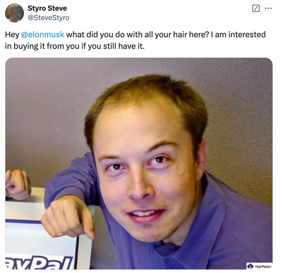 他还在推特上调侃起了马斯克:「你把你所有的头发都弄到哪里去了?我有兴趣买你的头发,如果你还留着的话。」