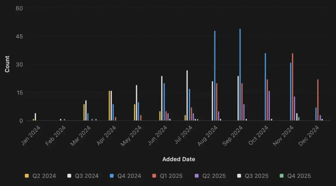 受牛市预期的影响,2024 年第 4 季度成为项目最热门的代币发行时间,其次是 2024 年第 3 季度和 2025 年第 1 季度。