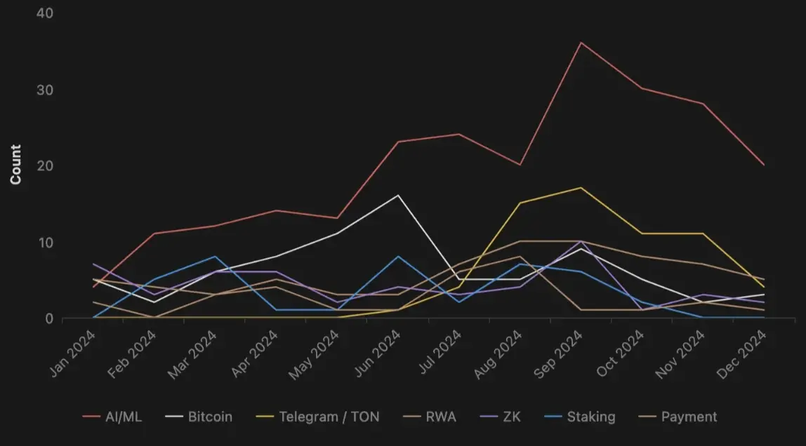 在第一季度 BTC 价格上涨的推动下,投资重点仍集中在基础设施领域,同时比特币生态系统 (Bitcoin Ecosystem) 也吸引了更多关注。对特定用例(如 Staking、跨链流动性等)的需求增加,使得这一领域的初创公司数量在第二季度显著增长。这种趋势反映了风投资金关注的后续效应。
