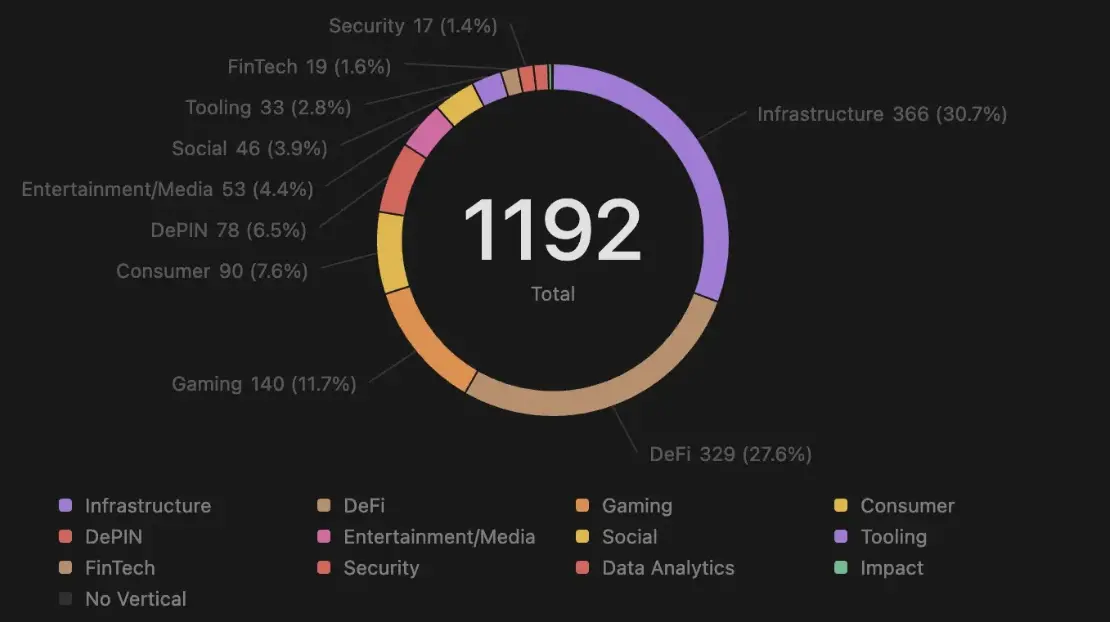 在所有审阅的融资交易中,基础设施 (Infrastructure) 依然是最受欢迎的融资领域,其次是去中心化金融 (DeFi)。与 2023 年相比,数据分析和工具 (Data Analytics and Tooling) 的融资热度显著下降,而 DePIN (去中心化的物理基础设施网络)、游戏 (Gaming) 和面向消费者的应用程序今年则表现出强劲增长。