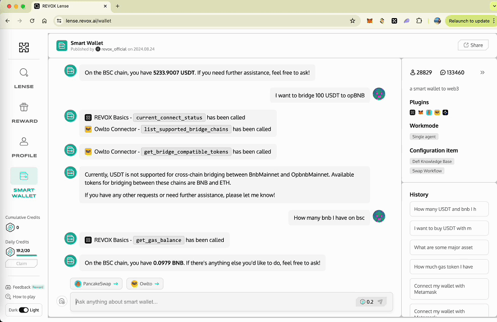 REVOX Lense 更像是「Web3 版 GPT」,为链上资产提供一站式信息整合与分析。目前 REVOX Lense 已吸引 1700 万用户,为 opBNB 上最大 dApp。REVOX Lense 可以与用户的钱包无缝集成,自动识别资产并展示与钱包资产相关的高质量新闻、社交媒体趋势和讨论。通过综合钱包数据,REVOX Lense 还将信息汇总为综合报告,为用户提供其资产表现、市场情绪和潜在未来趋势的整体视图。还可以解答用户在现有市场上遇到的投资问题,提供专业的回答,帮助用户对其资产组合做出明智的决策。