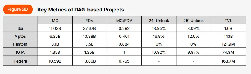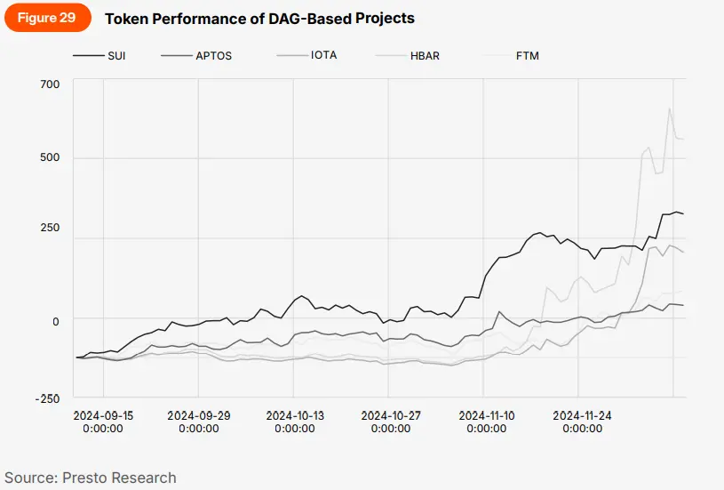 不仅是 Sui,整个 DAG 赛道都呈现出蓬勃发展态势。同样采用 DAG 技术的 Aptos 已跃升至非 EVM 公链 TVL 第四名,锁仓量达 11.3 亿美元。IOTA、HBAR、FTM 等 DAG 项目自 2024 年 9 月以来也都实现了至少 100% 的涨幅。