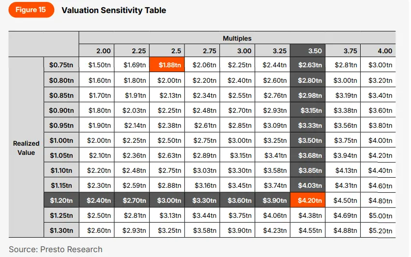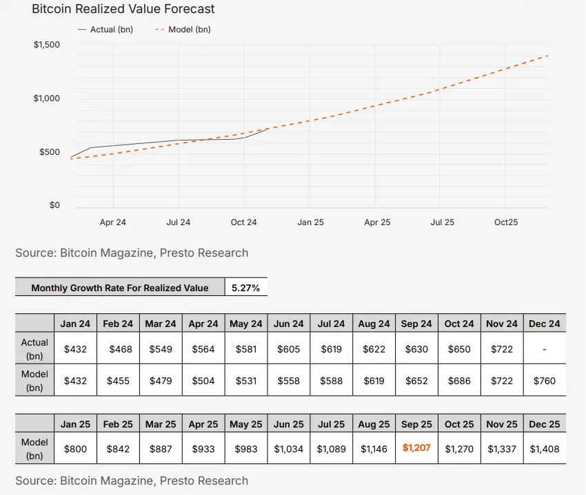 采用更保守的 3.5 倍乘数,并假设实现值从目前的 7220 亿美元以每月 5.3% 的复合增长率增长至 2025 年第三季度的 1.2 万亿美元 (这一增长率反映了现货 ETF 带来的机构准入便利化影响),得出 2025 年比特币网络目标价值为 4.2 万亿美元 (目前为 1.9 万亿美元),即每枚比特币 21 万美元。