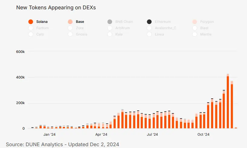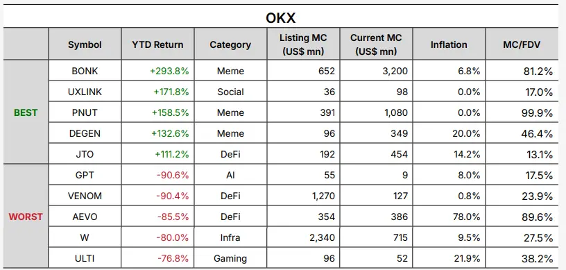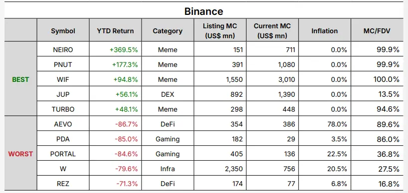 数据显示,存量代币的收益率反而高于新上币项目,这与传统认知形成反差。这一现象背后反映了 2024 年加密市场的重要变化:DEX 已成为代币早期价格发现的主要场所。