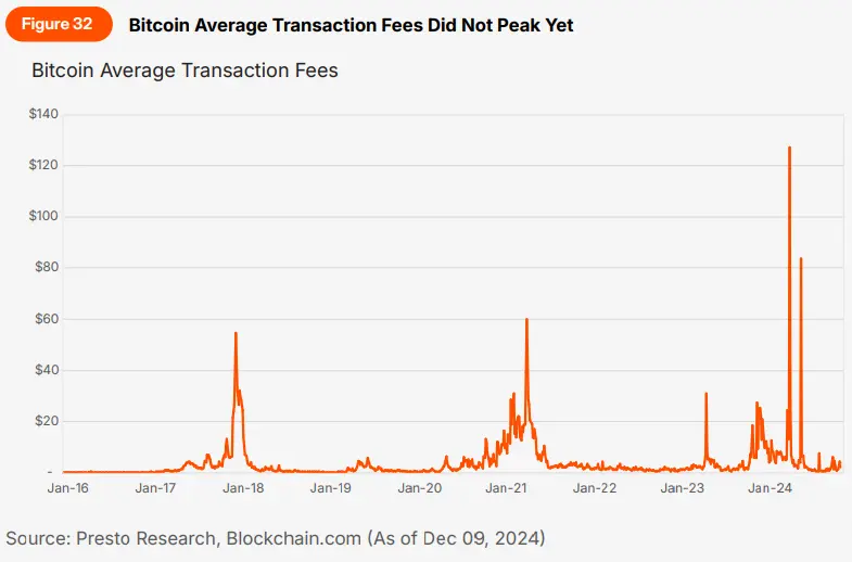 自 2023 年 Ordinals 协议推出以来,比特币网络的交易费用一度攀升至往期牛市的高点水平。不过,在即将到来的新一轮牛市前夕,交易费用已回归常态,这表明比特币的链上需求尚未完全释放。按照市场规律,如果 2025 年如预期般迎来牛市,比特币的链上使用率和交易费用很可能会创下历史新高。