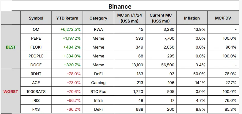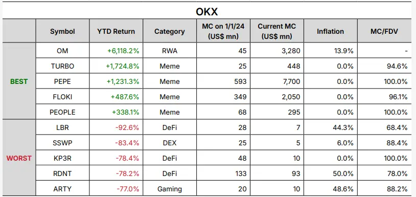 2024 年最亮眼的项目当属 Mantra(OM),其涨幅远超其他项目: