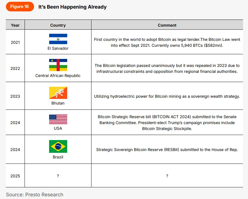 预计将有主权国家或标普 500 公司宣布将比特币纳入其储备策略。对于主权国家而言,"采用"指政府部门提议将比特币纳入国库储备。过去三年,每年至少有一个国家采取了类似行动。特朗普当选总统后关于比特币储备的竞选承诺,可能促使其他国家出于博弈论考虑研究类似策略。