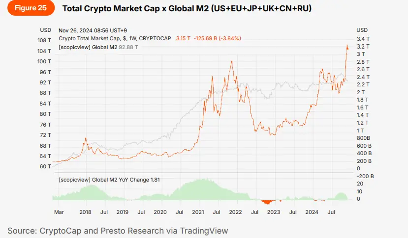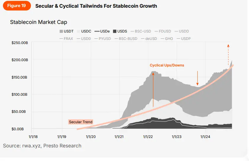 预计稳定币市值将在 2025 年达到 3000 亿美元,这一增长将受到长期和周期性因素的推动。长期驱动因素包括人们对代币化美元优越功能的认可,以及美国国会在稳定币立法方面的进展。周期性驱动因素包括更广泛的加密货币牛市周期。即使达到 3000 亿美元,这也仅占美元 M2 供应量的 1.4%,仍有巨大上升空间。
