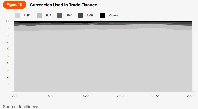 99% 的稳定币都与美元挂钩,这并非偶然。将资产代币化并不能凭空创造需求,而是需要被代币化的资产本身就具有全球需求。除美元外,很少有货币能享有如此普遍的需求,这从美元作为结算货币的主导地位可以看出。这就是为什么区块链与美元稳定币能够实现最佳的产品市场契合。
