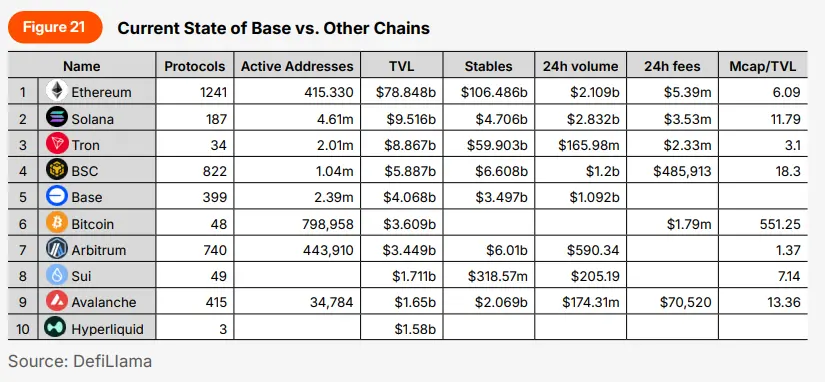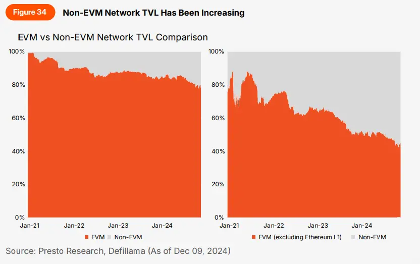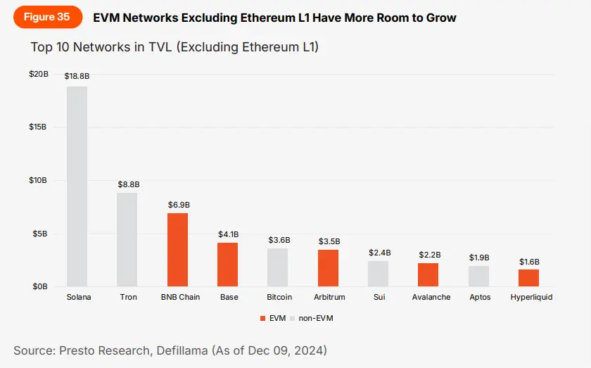 尽管 Solana 和 Sui 等网络增长显著,但 EVM 生态系统仍具有无可比拟的深度。它拥有最大的用户和开发者基础,流动性无可匹敌,TVL 达 1650 亿美元,是其他生态系统总和的四倍。这种主要以 ETH 为主的巨大流动性在 2024 年 Solana Meme 币狂热期间一直处于观望状态。然而,对 Hyperliquid、Ethena 和 Virtuals 等基于 EVM 的协议的兴趣增长表明了潜在需求的存在。