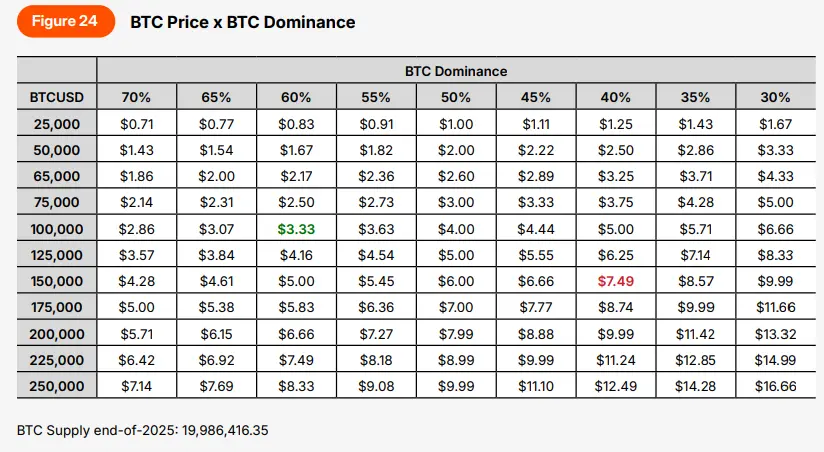 若比特币达到 15 万美元且维持 60% 市值占比,整体加密市场规模将达 7.49 万亿美元,是上轮高点(2021 年 11 月,2.9 万亿美元)的 2.5 倍以上。