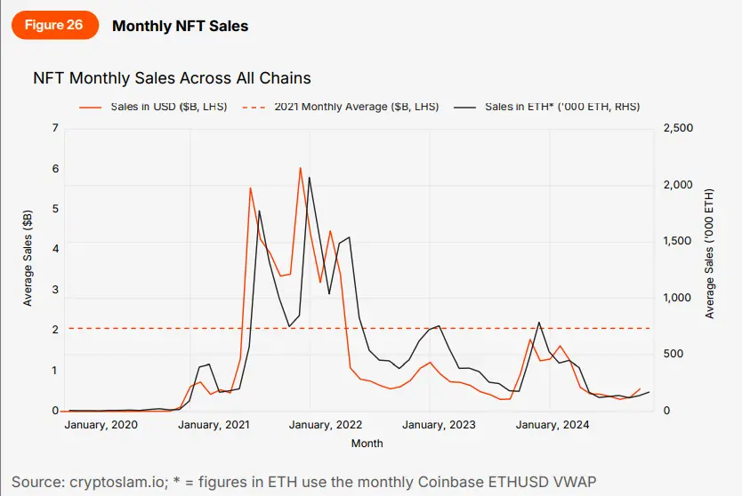 当前数据支持这种文化复兴的潜力,2024 年 11 月 NFT 销售额达到 5.62 亿美元,环比增长 57.8%。NFT 亚文化的持续发展和对更广泛加密文化的影响,从垃圾艺术到生成艺术的独特艺术运动的出现,反映了一个日益成熟的生态系统。