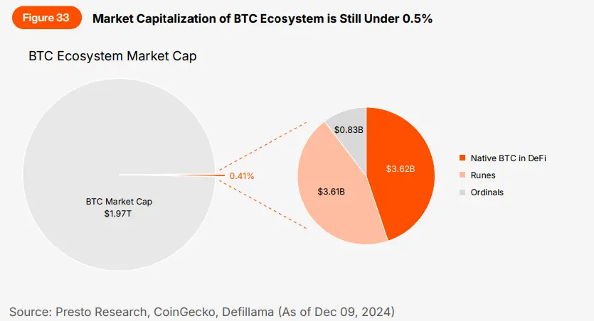 经历多个周期后,比特币越来越被公众接受为数字黄金和价值储存手段。自 2023 年以来,众多协议涌现以释放比特币作为数字黄金的全部潜力。原生比特币协议如 Ordinals 和 Runes 通过直接在其区块链上铸造代币和 NFT,使比特币成为原生 DeFi 的基础层。此外,各种 L2 解决方案和再质押协议开始利用比特币产生收益。