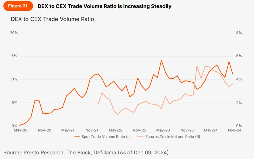 虽然 Binance 和 Coinbase 等 CEX 仍是大多数投资者的主要交易平台,但随着牛市进展,DEX 对 CEX 的交易量比率逐渐上升。这一趋势预计在明年将加速,现货交易量比率可能超过 20%,永续合约交易量比率可能超过 10%。