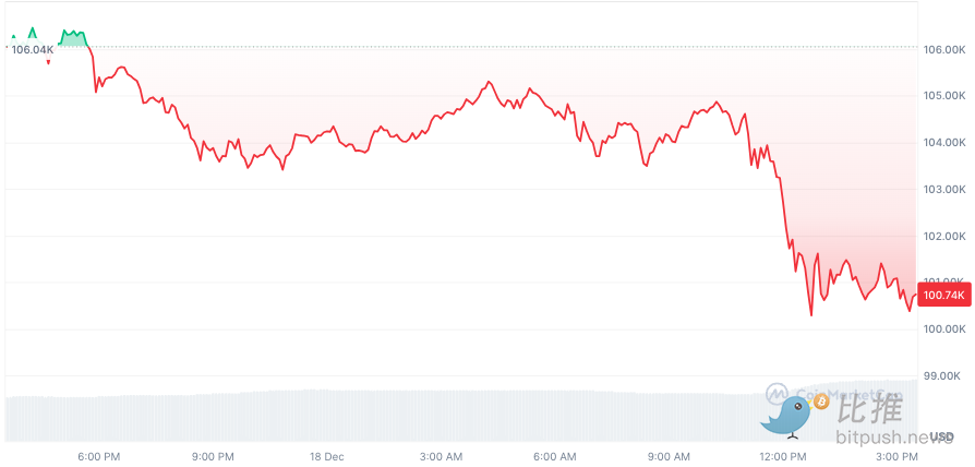 比特币在美联储公告发布后跌至 104,000 美元,随后在鲍威尔发言后最低回踩至 100,256 美元附近,24 小时内下跌近 5%。山寨币跌幅更大,XRP、 ADA、 LTC 下跌近 10%。