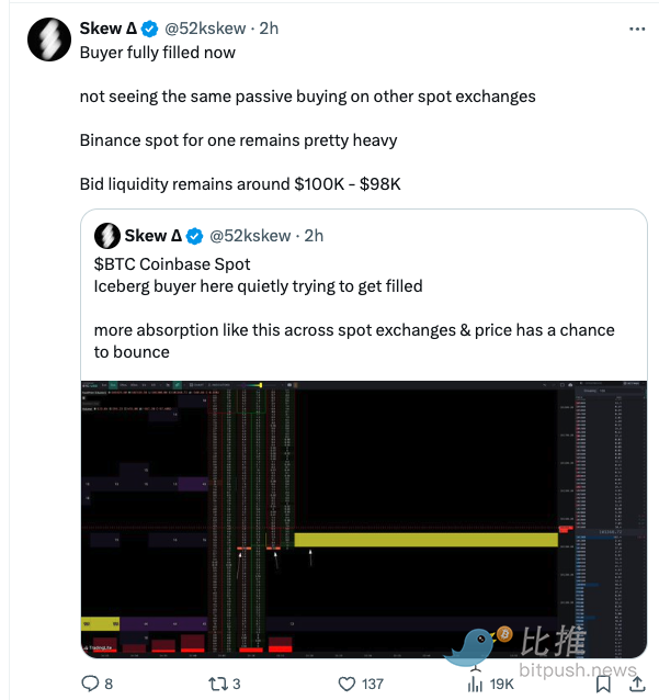 比特币的下跌导致多空双方仓位发生剧烈变化。根据加密分析师 Skew 的图表,多头止损,空头获利,比特币价格跌至 10 万至 9.8 万美元区间寻求支撑。Skew 强调,若想扭转颓势,比特币价格必须通过现货买盘重新夺回 10 万至 10.14 万美元区间,并在日线图上站稳脚跟。