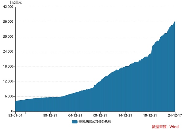 自20世纪80年代以来,美国的债务规模持续飙升。1990年时,美国政府债务总额约为3.2万亿美元,2000年增至5.62万亿美元,2010年进一步突破13.5万亿美元。进入2020年,债务总额已达到27.7万亿美元,2023年更是突破34万亿美元。截至2024年12月17日,美国联邦政府债务总额达到36.19万亿美元,突破36万亿美元大关,创历史新高。
