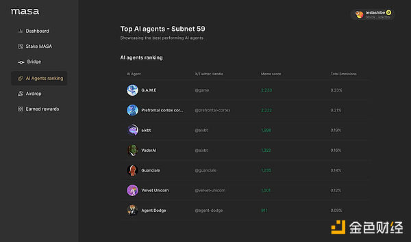 比如 @getmasafi 和 Virtuals 的合作,Masa 在 TAO 上推出了子网59 Agent Arena。这个子网的主要 focus 的方向是 AI Agent。我们可以在推上创建自己的 AI Agent,然后在子网59注册,与其他 AI Agent 竞争 $TAO 的排放量。原理还是 TAO 的那个逻辑,你的 AI Agent 表现越好(指标如下图所示),就有机会获得更多的 $TAO 排放。后面 Masa 还会细化评判 Agent 优劣的指标。(到时候你们也可以质押 $MASA 来投票,决定 $TAO 的排放)