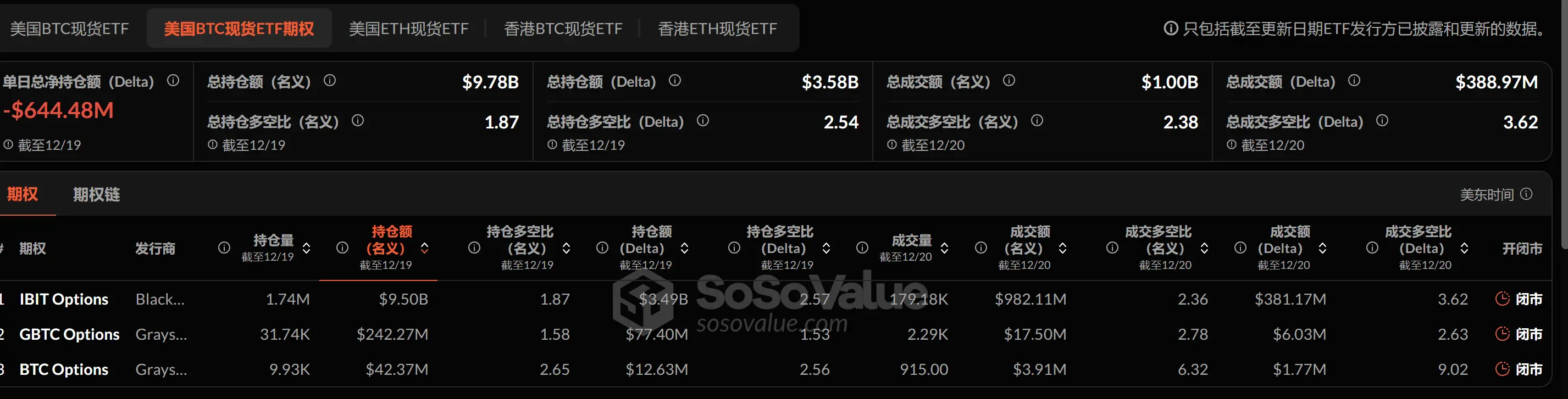 截至 12 月 20 日,美国比特币现货 ETF 期权名义总成交额达到 10 亿美元,名义总成交多空比为 2.38,显示市场上多头较为活跃。截至 12 月 19 日美国比特币现货 ETF 期权名义总持仓额达 97.8 亿美元,名义总持仓多空比达 1.87,进一步表明多头市场的主导地位。