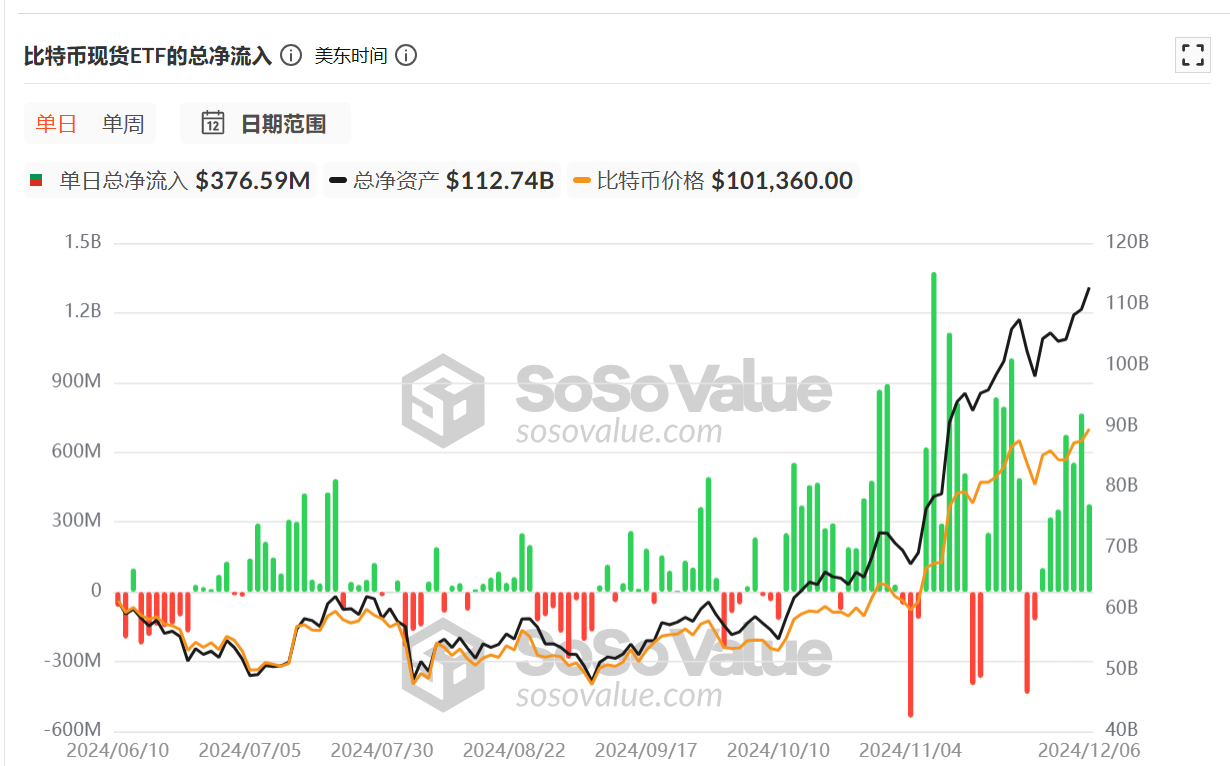 截止 12 月 9 日,比特币的总净流入已升至 334.3 亿美元,且数据仍未有放缓迹象。