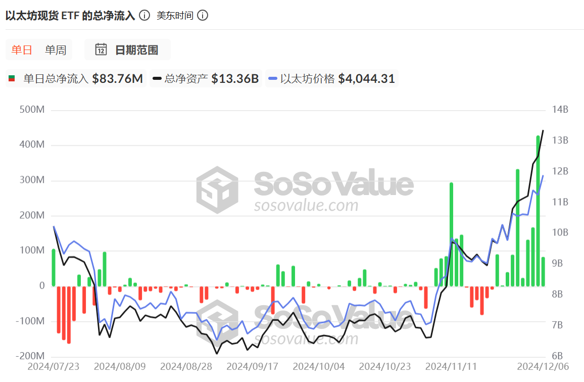 截止 12 月 9 日,以太坊现货 ETF 总累计净流入升至 14.1 亿美元。