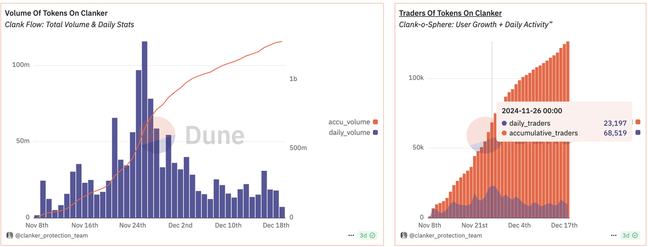 比如 Clanker,作为 Base 生态上的 AI Agent 明星项目,可以从链上数据可以看到在 11 月 26 号之后,无论是发行的代币数量、交易者还是链上收入都开始下滑,而这样的趋势也立即反应在了代币价格上。