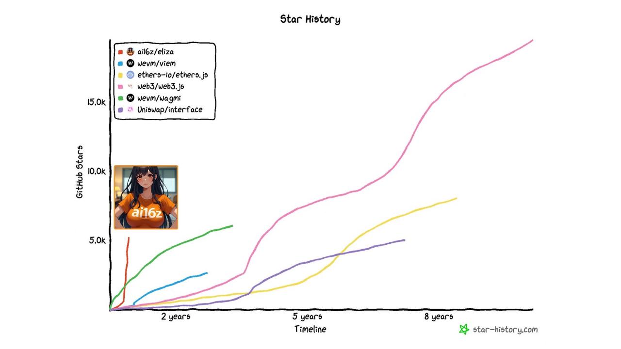 如上图所示,可见 ai16z/Eliza 的开发者关注度,在短短一个月时间超过了 uniswap。可见开发者对这一框架的兴趣程度。另外一组数据也可以进行对比:Sui 目前是 6400 个 stars ,Solana 1.3 万个 stars ,以太坊 5 万个 stars ,Base 7 万个 stars 。