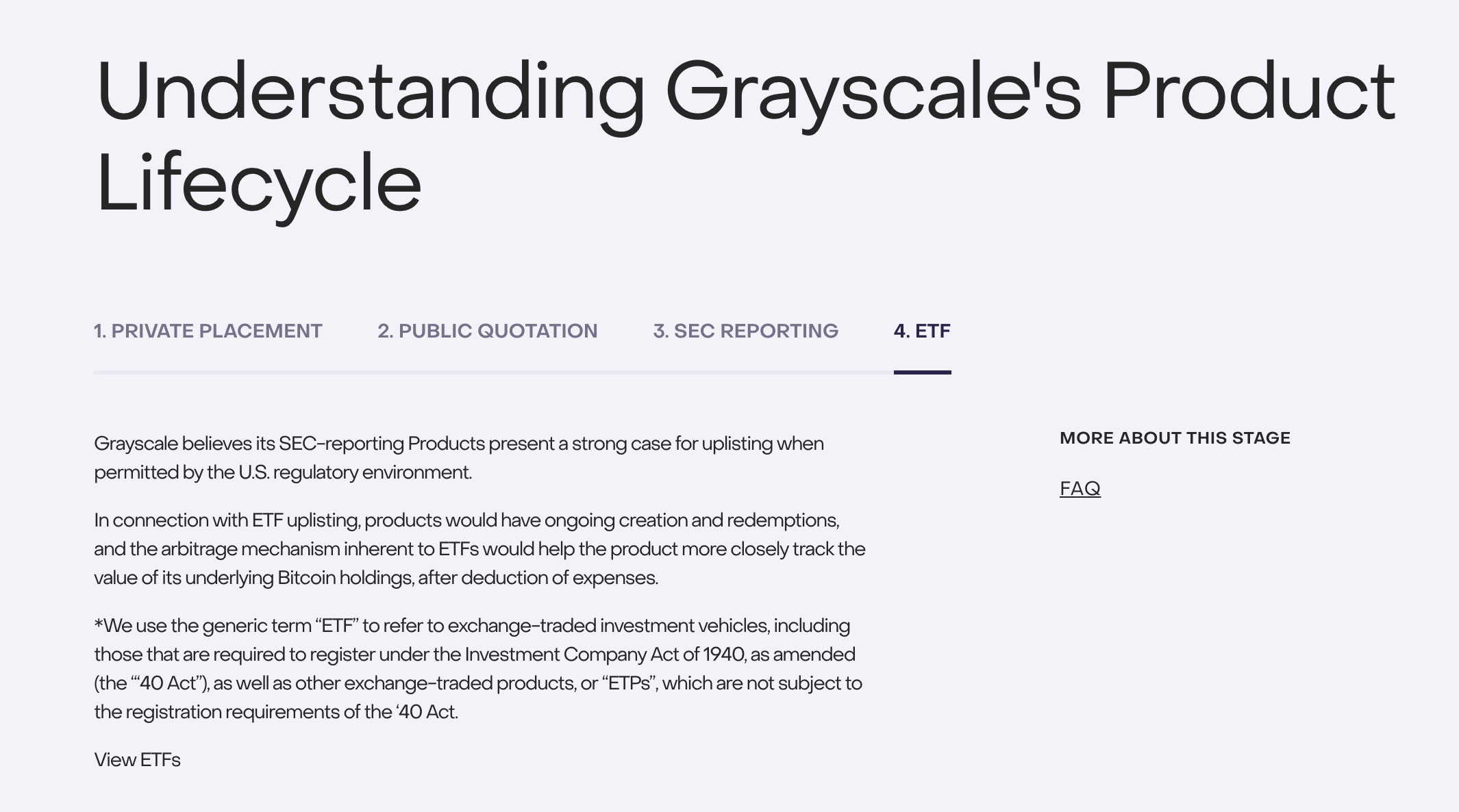 SEC REPORTING:灰度产品是首家向 SEC 报告的公司。向 SEC 报告的要求将会进一步提高披露水平,为投资者提供更大的透明度,并使产品受到额外的监管监督。目前 ETCG、ZCSH、HZEN 等都属于该阶段。