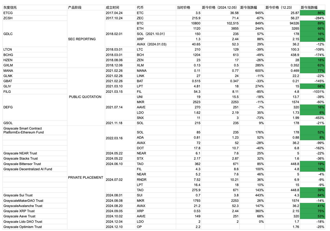 为追踪灰度基金投资回报率,笔者记录了灰度基金推出信托时的代币价格和 12 月 23 日代币价格,制成以上图表。从时间来看,灰度推出加密信托产品的时间之前集中在 2018、2021 年,而这时多为牛市阶段性高点或后半程。这一现象可能与灰度推出基金需要经过较为漫长的周期和相对成熟的市场有关。而今年 12 月灰度又开始集中推出信托基金,这次是否能打破短期高点的循环。