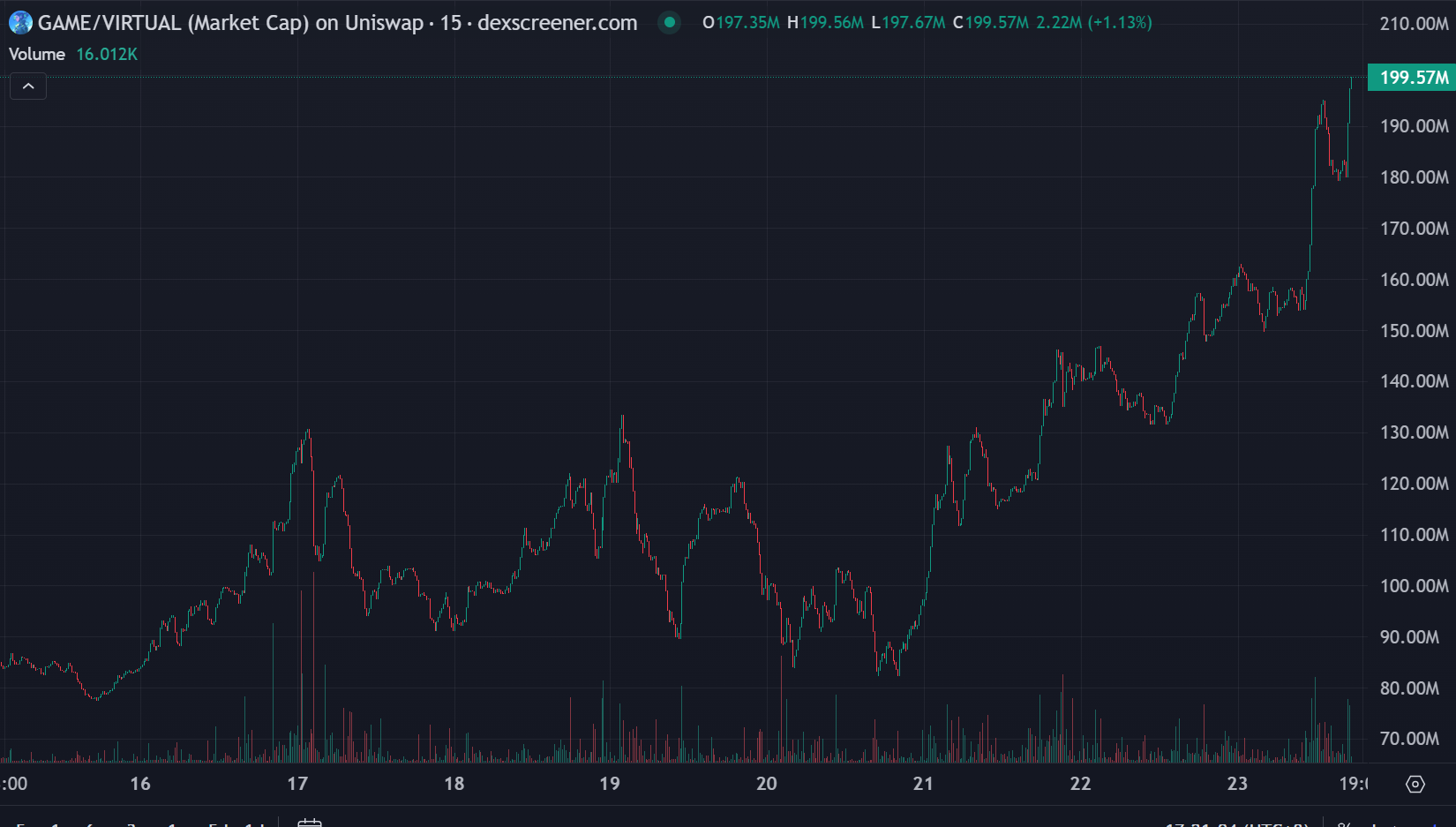 今日的 GAME 市值最高触及 1.938 亿美元,交易量突破 400 万美元。作为 Virtual 生态中至关重要的基础设施代币,GAME 的潜力终于被市场所发现,引发了强烈的关注。