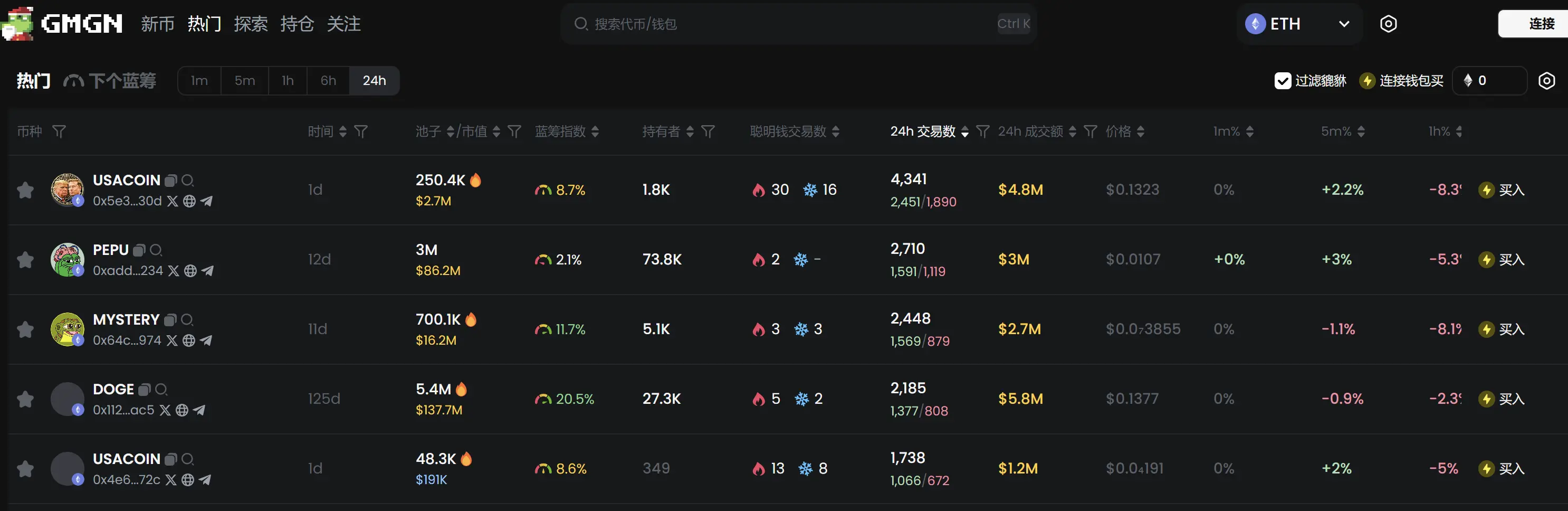 过去 24h 以太坊热门代币前五依次为:USACOIN、PEPU、MYSTERY、DOGE、USACOIN