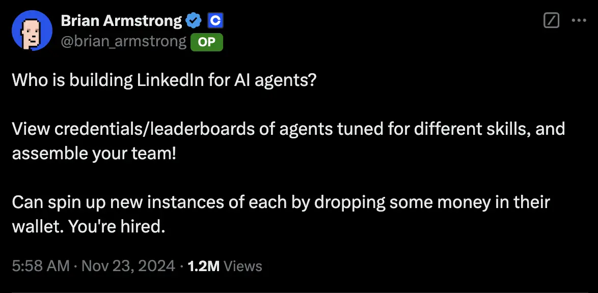 随后,Luna 连续发布了 12 条推文,平均浏览量为 1.8 万次,其中并未有突破十万次浏览量的推文。不过这算是一次新鲜的尝试,AI Agent 已经被誉为数字劳工,Coinbase CEO Brian Armstrong 询问现在有谁在为 AI Agent 打造领英平台,「用户可以查看不同技能调优的代理的资质和排行榜,并根据需要组建自己的团队。只需向代理的钱包中投入一定金额,就能快速创建新的代理实例,从而完成招聘过程。」