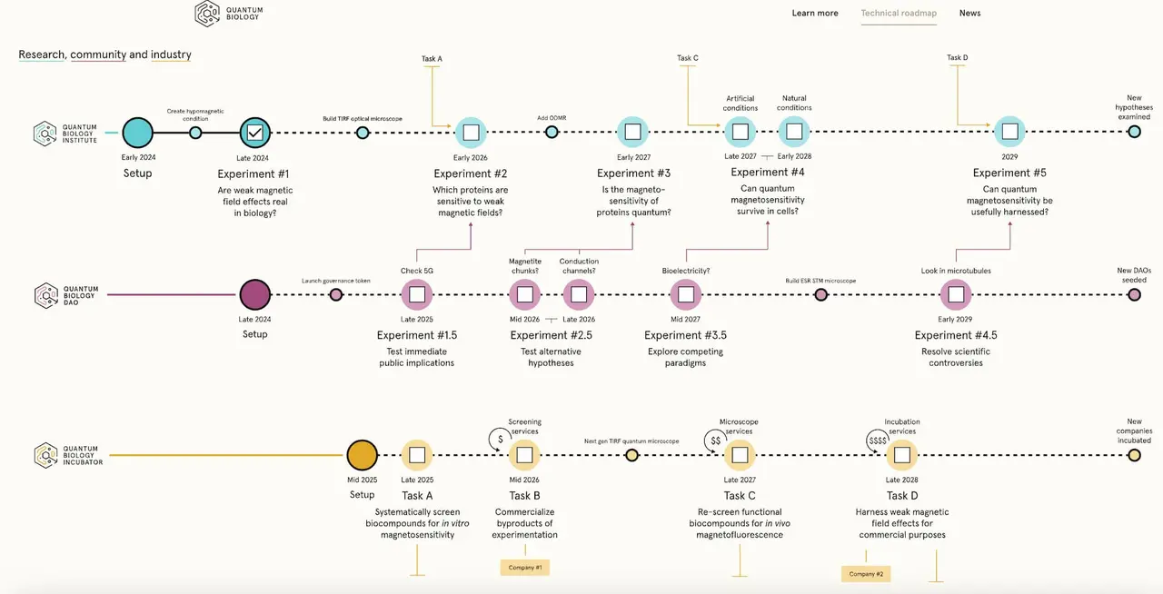 Quantum Biology Incubator 则专注于孵化那些旨在将量子生物学研究成果商业化的初创公司,目标是成为量子生物学领域初创公司首选的仪器设备和实验室空间提供商。尽管目前 Quantum Biology Incubator 尚未成立,但为了更有效地协调各方激励,研究所和 DAO 计划在其成立时持有部分股份。这样,孵化器的任何成功毕业都将为研究所和 DAO 带来资金回馈,最终推动实现完全的自给自足。