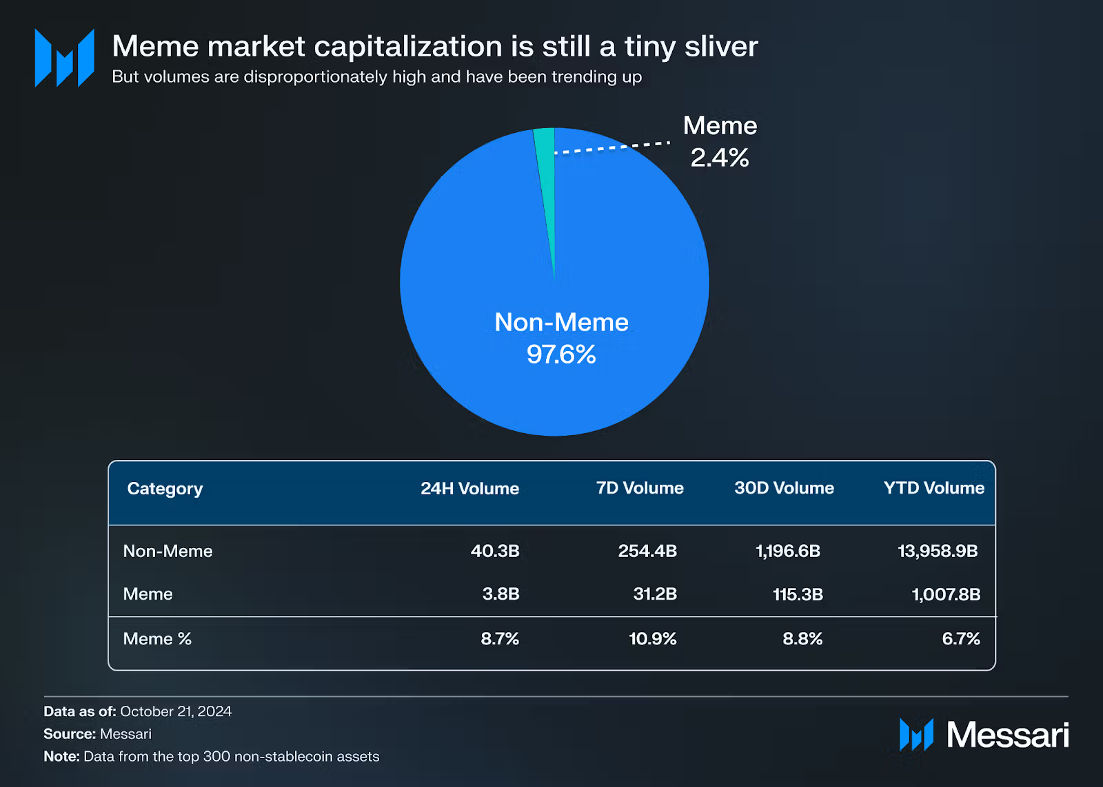 · Meme 币虽然在市值上仅占前 300 大加密货币(不含稳定币)的 3%,但其交易量却持续占据 6-7% 的份额,近期甚至攀升至 11%;