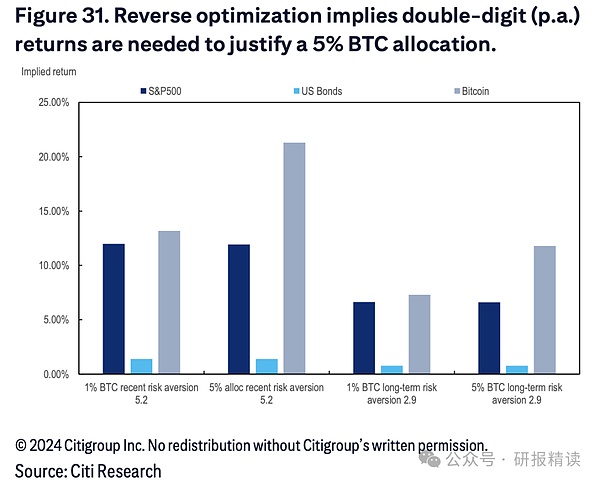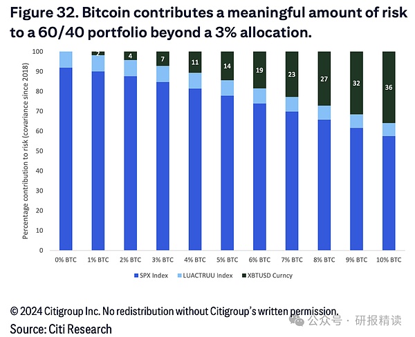 面对这种风险收益特征,贝莱德投资研究所为机构投资者提供了务实的配置建议。研究表明,在传统60/40股债组合中配置1%至2%的比特币是"合理范围",这种配置能在把握投资机会的同时有效控制风险。若配置超过2%,整体投资组合的风险水平将显著提升——例如,5%的比特币配置会使得风险贡献从0%升至10%以上,10%的配置则会导致波动性贡献攀升至36%。