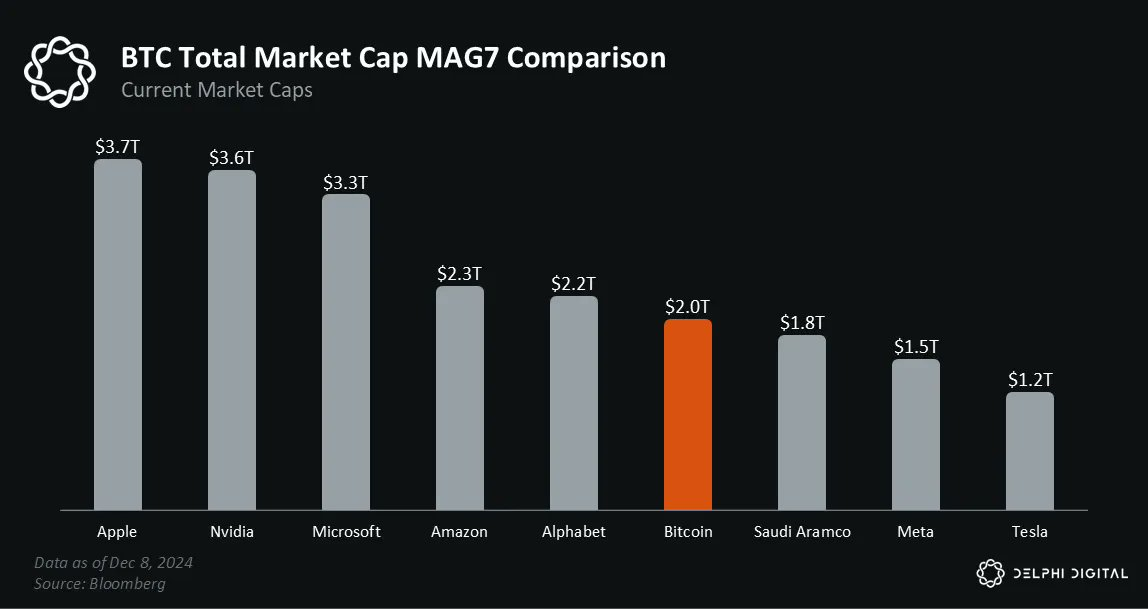 而现在,这种观点已经发生了翻天覆地的变化。比特币目前的市值约为 2 万亿美元——令人瞩目。如果将比特币视为一家上市公司,它将成为全球第六大最有价值的公司。