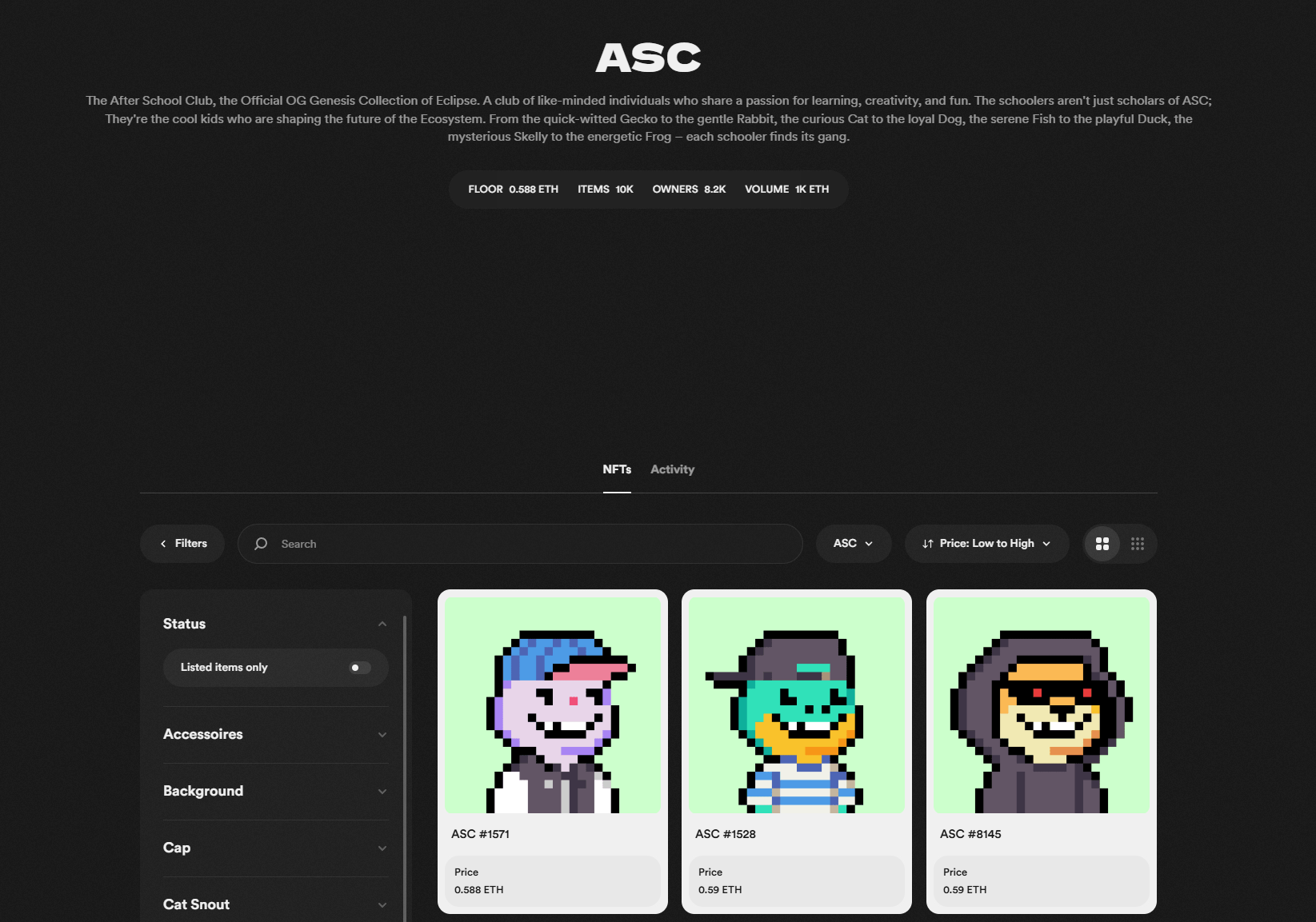 这个链一句话总结就是「以太坊上的 Solana」,官方 NFT 系列叫 ASC(@asclubnft),现在已经涨到约 0.6 ETH 的地板了。