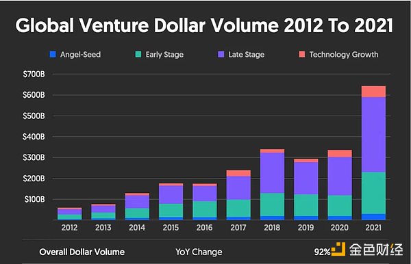 2021年,风险资本活动达到6120亿美元,比前一年增加了108%。10年内,全球风险投资的美元规模同比增长92%。