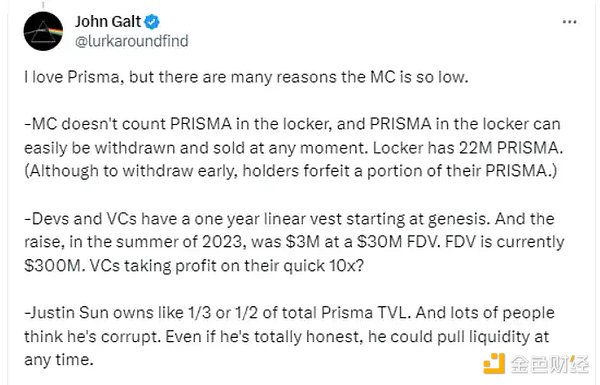 ·PRISMA 的流通市值未将锁仓代币考虑在内,项目里大约有 2200 万 PRISMA 没有被计算;