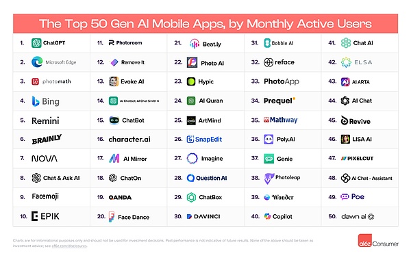 a16z 的移动榜单完全是新的。ChatGPT 在这里也领先——但优势较小。就每月活跃用户而言,ChatGPT 的规模大约是第二名和第三名,Microsoft Edge 和 Photomath 的 2.5 倍。对于移动产品,前五名由微软的搜索引擎 Bing(现已围绕 AI 重建)和照片增强及头像创建器 Remini 补齐。
